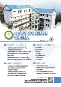 Kros College, Kohima Nagaland, established in 2005, is a premier institution affiliated with Nagaland University. Offering diverse undergraduate programs in Arts, Commerce, and Science, it provides a strong academic foundation. Known for its dedicated faculty and nurturing environment, the college focuses on holistic student development in the vibrant region of Kohima.