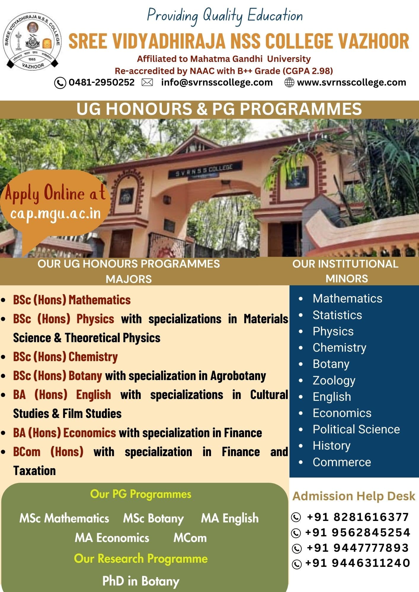 Sree Vidyadhi Raja N.S.S. College is a distinguished Arts and Science college established in 1964 in Kottayam, Kerala. The Sree Vidyadhi Raja N.S.S. College, a non-private college member, offers a substantial 22 courses across various disciplines. Further, SVR NSS College is quite renowned; the institute has students enrolled in diverse programs. These include robust offerings in Arts, Science, and Commerce, also encompassing several research programs such as the PhD Botany and PhD History options. This distinguished institution (Sree Vidyadhi Raja N.S.S. College) operates through more than 16 specialized departments. SVR NSS College is deeply committed to academic excellence and is recognized by appropriate regulatory bodies; this premier college is notably affiliated with Mahatma Gandhi University, Kottayam. Sree Vidyadhi Raja N.S.S. College continues its legacy.