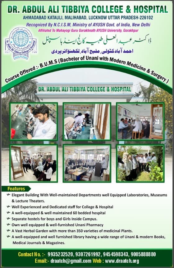 Dr. Abdul Ali Tibbiya College and Hospital, Lucknow, is a premier Unani medical institution established in 1993. Affiliated with Mahatma Gandhi Kashi Vidyapith, Varanasi, it is known for its Bachelor of Unani Medicine & Surgery (BUMS) program, offering comprehensive academic and clinical training across 14 departments.