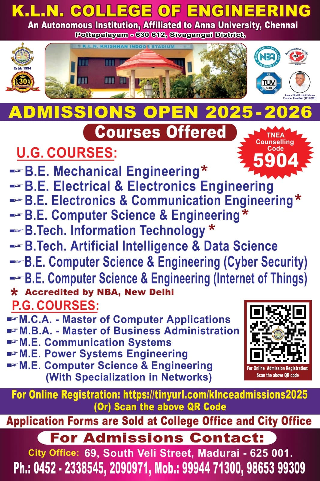 K.L.N. College of Engineering, established in 1994 in Sivagangai, Tamil Nadu, is a premier institution affiliated with Anna University. Approved by AICTE, it offers diverse UG and PG engineering, technology, and management programs. Renowned for academic excellence and a vibrant campus spanning 120 acres, KLNCE focuses on holistic development.