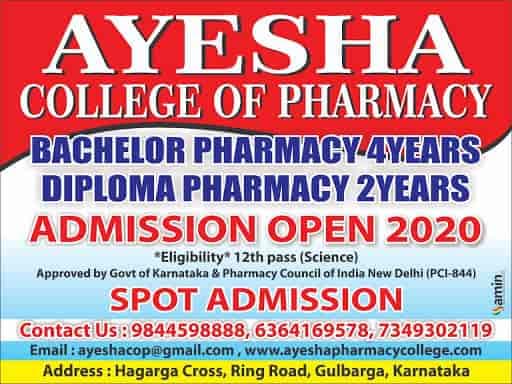 AYESHA COLLEGE OF PHARMACY KALABURAGI stands as a premier institution established in 1990 in Kalaburagi, Karnataka. Affiliated with Rajiv Gandhi University of Health Sciences, Bangalore, it offers D.Pharm, B.Pharm, and M.Pharm programs. Recognized for its dedicated faculty and focus on pharmaceutical education, the college is a prominent hub for aspiring pharmacists.