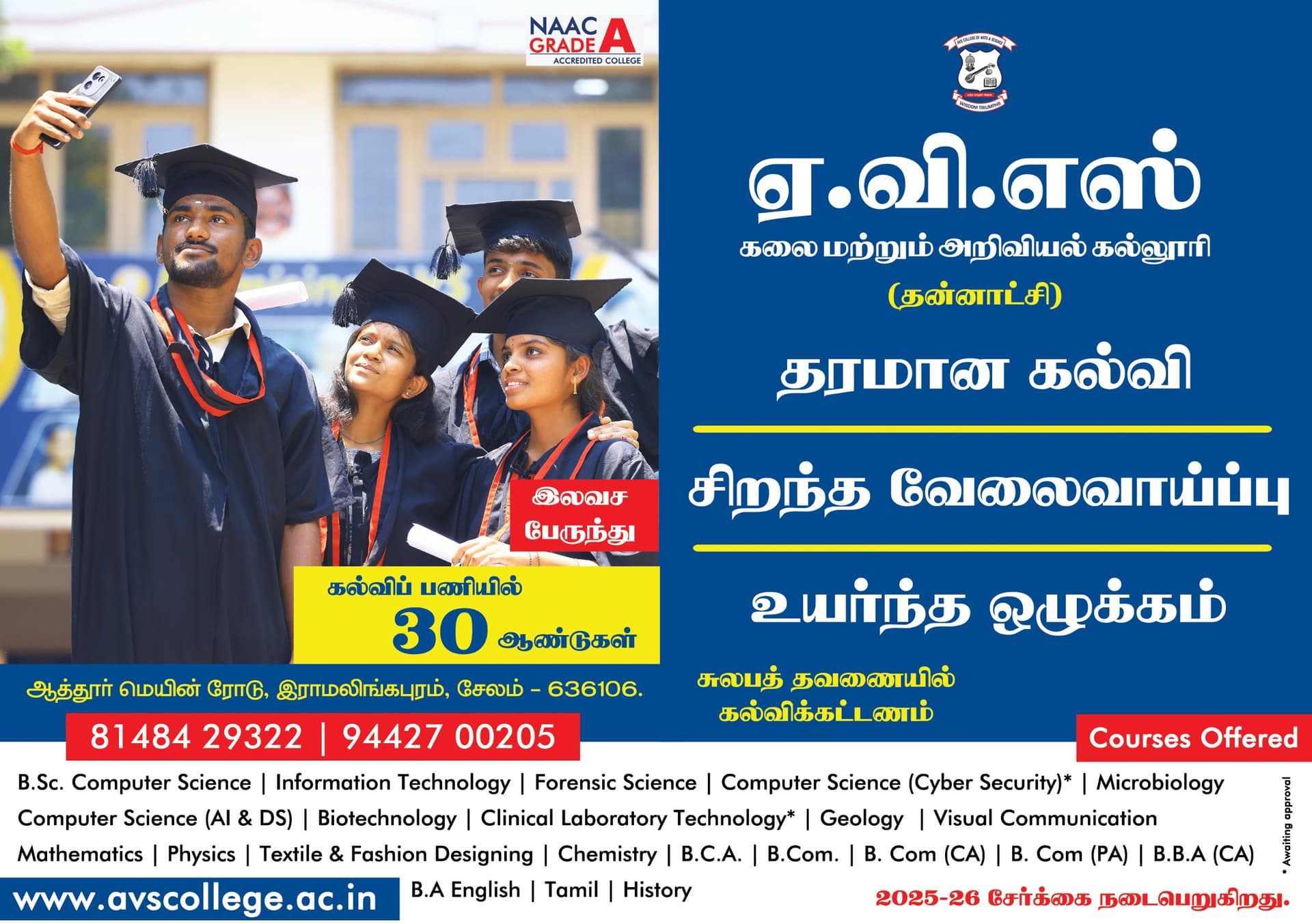 AVS College of Education is a distinguished teacher training institution, established in 2005 in Salem, Tamil Nadu. As a notable non-private college member, the AVS College of Education offers a total of 2 courses across various disciplines. These include the Bachelor of Education (B.Ed) and Master of Education (M.Ed) programs. AVS CoE is quite renowned; this institute has a total capacity for up to 150 students enrolled in its various educational programs. This reputed premium institute (AVS College of Education) operates through more than engineering, management specialized departments, supported by over 21 dedicated faculty members. AVS College of Education is further committed to academic excellence, and the college is recognized by appropriate regulatory bodies, importantly affiliated with Tamil Nadu Teachers Education University, Chennai (often referred to as a premier college).