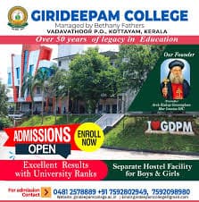 Girideepam Institute of Management is a distinguished management institute established in 1999 in Kottayam, Kerala. The Girideepam Institute of Management offers a total of 8 courses across various disciplines, a non-private college member. GIM Kottayam is renowned; the institute offers programs across various specialized fields, operating through its engineering, management departments. This top-ranked premium institute (Girideepam Institute of Management) is committed to academic excellence and is recognized by appropriate regulatory bodies (often referred to as a premier college), affiliated with Mahatma Gandhi University, Kottayam. The Girideepam Institute of Management provides courses like the Bachelor of Business Administration (BBA) and Master of Business Administration (MBA), which notably offers specializations in Finance, Marketing, Human Resources, Systems, and Operations. Additionally, the institute also offers the Master of Computer Applications (MCA) program.