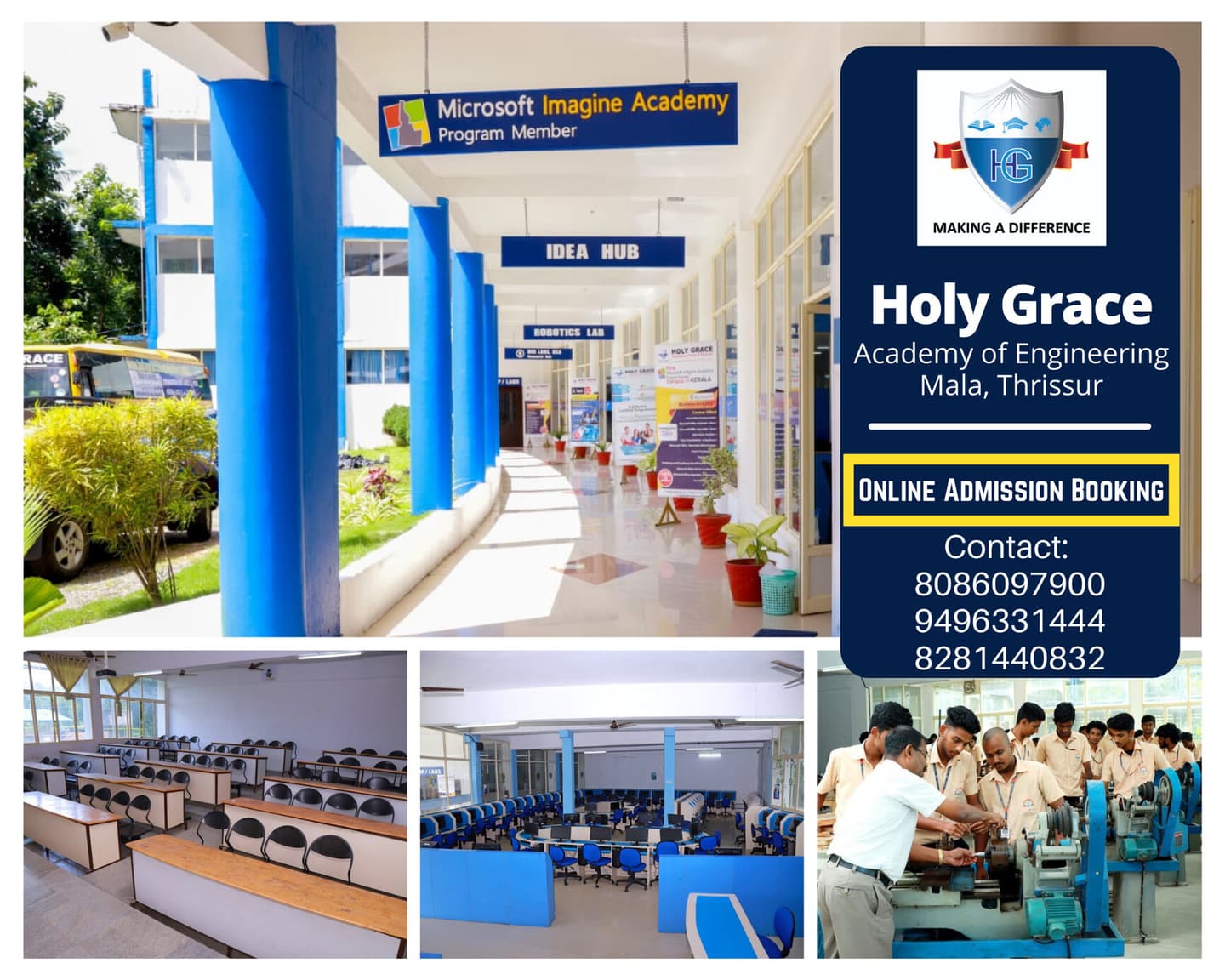 Holy Grace Academy of Engineering, Thrissur, Kerala, is a premier institution established in 2004. Affiliated with APJ Abdul Kalam Technological University, it offers 11 B.Tech and M.Tech programs, notably in Computer Science. The college is recognized for its strong academics and extensive 300-acre campus.