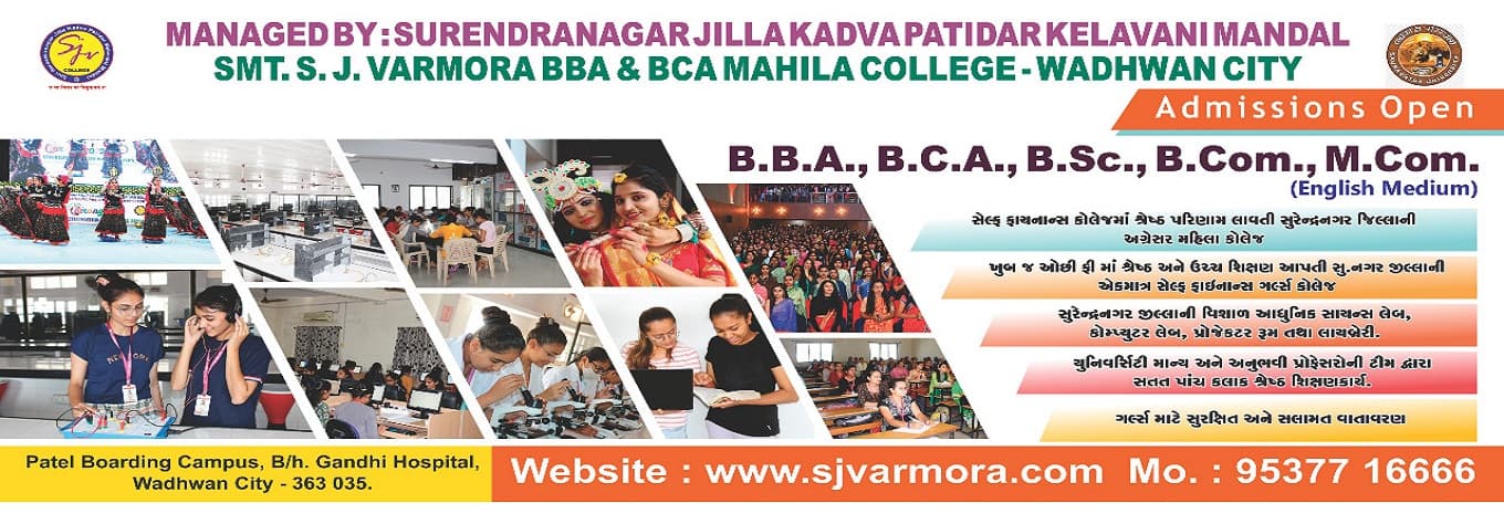 Smt. S.J. Varmora BBA BCA Mahila College, established in 2007 in Surendranagar, Gujarat, stands as a dedicated women''s institution affiliated with Saurashtra University, Rajkot. It offers robust BBA and BCA programs, fostering academic excellence and empowering women. The college holds a NAAC ''B'' Grade accreditation.