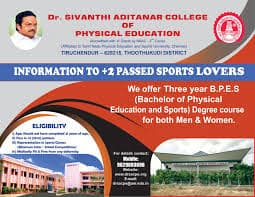 Dr. Sivanthi Aditanar College of Physical Education, Thoothukudi, Tamil Nadu, established in 1993, is a premier institution affiliated with Tamil Nadu Physical Education and Sports University, Chennai. A dedicated hub for physical education, it offers specialized B.P.Ed, M.P.Ed, M.Phil, and Ph.D programs, fostering academic and athletic excellence.