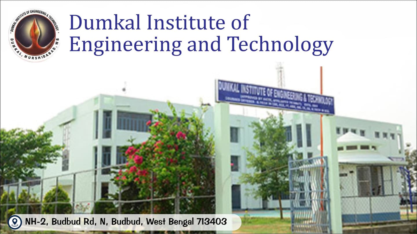Dumkal Institute of Engineering & Technology, established in 2005 in Murshidabad, West Bengal, is a premier institution affiliated with MAKAUT. It offers robust B.Tech, MBA, MCA, BCA, and BBA programs, known for academic excellence, a vibrant campus, and strong career outcomes.