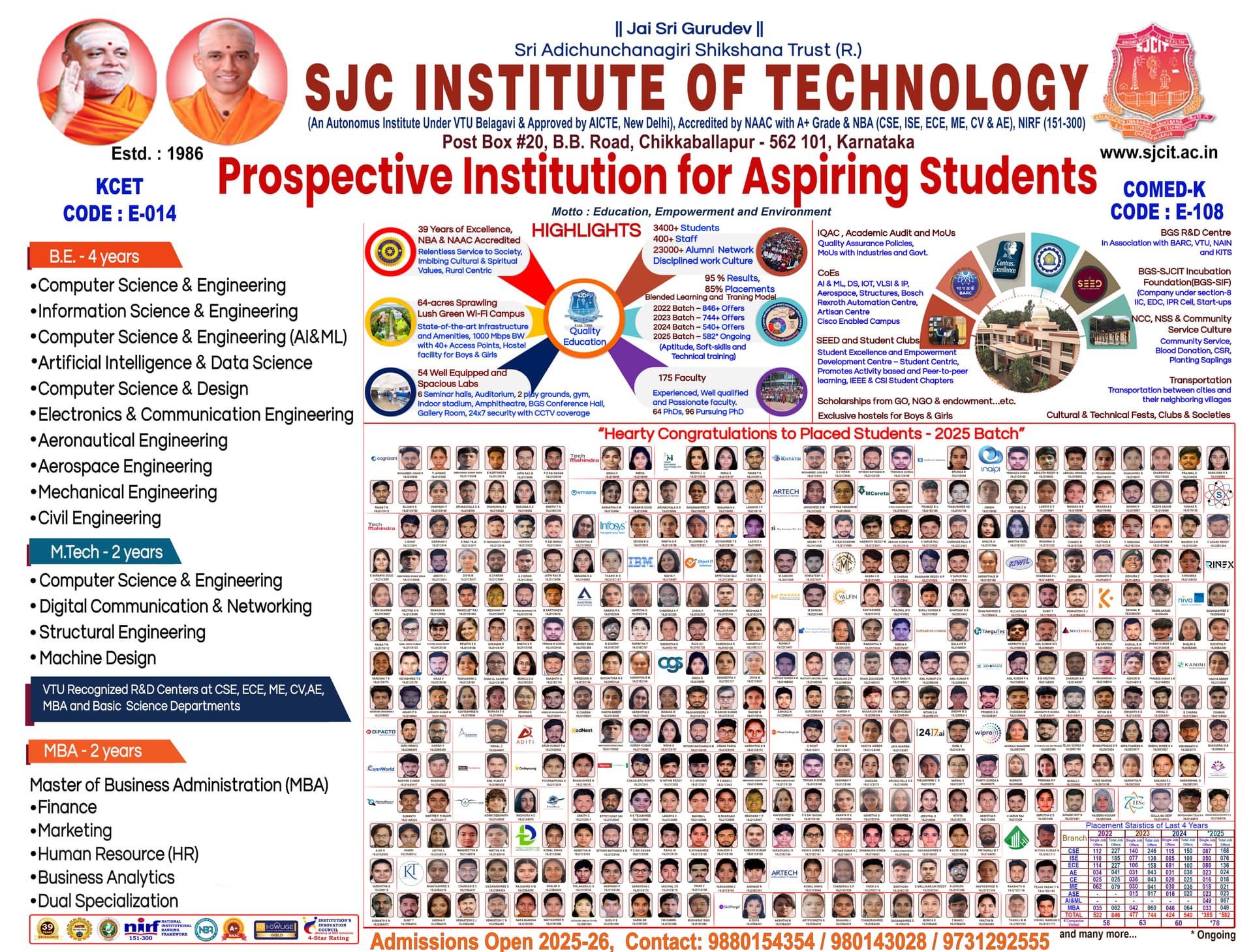 Sri Jagadguru Chandrashekaranatha Swamiji Institute of Technology is a distinguished engineering institute established in 1986 in Chikkaballapura, Karnataka. The Sri Jagadguru Chandrashekaranatha Swamiji Institute of Technology offers a total of 13 courses across various disciplines, a non-private college member. SJCIT is renowned; the institute has students enrolled in various programs including Engineering and other specialized fields across its departments. This top-ranked premium institute (Sri Jagadguru Chandrashekaranatha Swamiji Institute of Technology) operates through more than 14 specialized departments. SJCIT is committed to academic excellence and is recognized by appropriate regulatory bodies (often referred to as a premier college). The campus of Sri Jagadguru Chandrashekaranatha Swamiji Institute of Technology spans 52 acres. Further, the institute received a 4 Star Rating by ARIIA in 2021. Affiliated with Visvesvaraya Technological University (VTU), Belagavi, SJCIT accepts entrance exams such as KCET, COMEDK, PGCET, GATE, and KMAT for its 1074 total seat capacity.