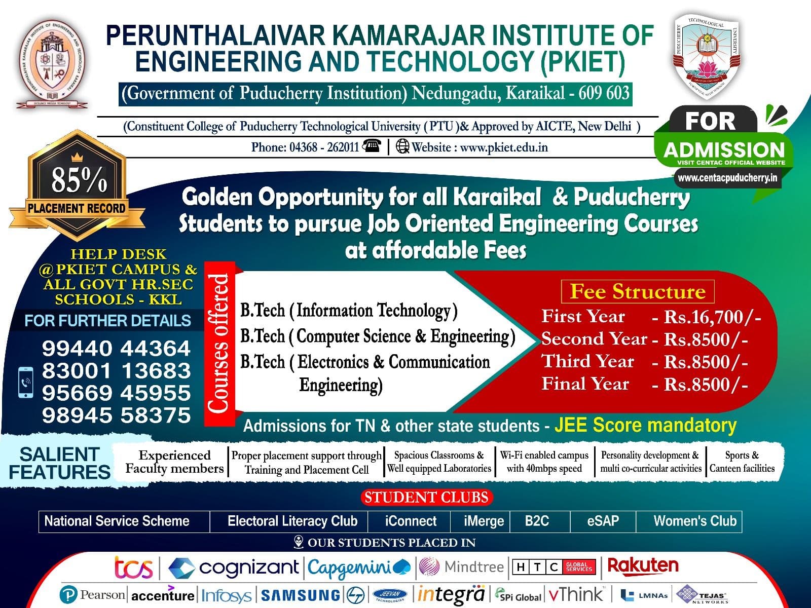 Perunthalaivar Kamarajar Institute of Engineering and Technology (PKIET) is a premier government institution located in Karaikal, Puducherry. Established in 2007, and affiliated with Pondicherry University, it offers 5 AICTE-approved B.Tech programs across its 50-acre campus. PKIET is recognized for its academic strength in engineering.