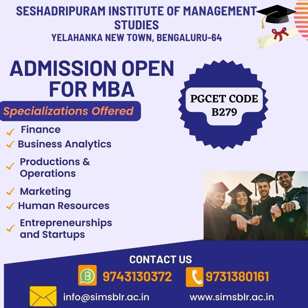Seshadripuram Institute of Management Studies is a distinguished management institute, established in 2001 in Bengaluru Urban, Karnataka. The Seshadripuram Institute of Management Studies offers a total of 1 core course across various management disciplines, operating as a non-private college member, affiliated with Bengaluru City University. SIMS Bengaluru is renowned; the institute focuses primarily on management education, offering flagship courses like the Bachelor of Business Administration (BBA) and Master of Business Administration (MBA). This top-ranked premium institute (Seshadripuram Institute of Management Studies), which operates through 1 specialized department, has been ranked within the 151-200 band by NIRF 2023 under the Management category. SIMS Bengaluru is committed to academic excellence and is recognized by appropriate regulatory bodies (often referred to as a premier college). Further, Seshadripuram Institute of Management Studies also boasts international collaborations, including arrangements with Lincoln University College, Malaysia, and Management Development Institute, Singapore.
