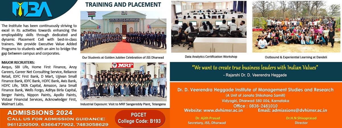 Dr. D. Veerendra Heggade Institute of Management Studies and Research is a distinguished management institute established in 1999 in Dharwad, Karnataka. The Dr. D. Veerendra Heggade Institute of Management Studies and Research offers a total of 1 course, specifically the Master of Business Administration (MBA), across various disciplines. This non-private college member (often referred to as JSS Dharwad) is quite renowned. JSS DVHIMSR, the institute, has a capacity for up to 120 students enrolled in its Management programs. This top-ranked premium institute (Dr. D. Veerendra Heggade Institute of Management Studies and Research) operates through its 1 specialized department with over 14 dedicated faculty members. JSS DVHIMSR is committed to academic excellence and is recognized by appropriate regulatory bodies, often considered a premier college.