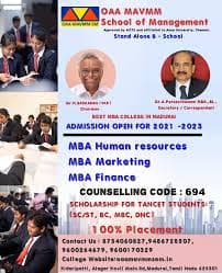 OAA-MAVMM School of Management, located in Madurai, Tamil Nadu, is a premier institution established in 2007. Affiliated with Madurai Kamaraj University and approved by AICTE, it offers flagship MBA and Executive MBA programs. The school is known for its focused management education and dedicated faculty.