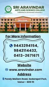 Sri Aravindar Arts & Science College, Villupuram, is a premier co-educational institution affiliated with Annamalai University. Established in 2007, it offers a wide array of UG and PG programs across 9 departments. With a NAAC B+ grade and a sprawling 30-acre campus, it focuses on quality education.