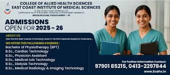 College of Allied Health Sciences, East Coast Institute of Medical Sciences, Pondicherry Puducherry stands as a premier institution established in 2017. Affiliated with Pondicherry University, it offers 6 specialized B.Sc. programs in vital healthcare domains like Medical Lab and Imaging Technology. Situated on a sprawling 110-acre campus, it is dedicated to nurturing skilled allied healthcare professionals.